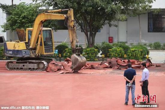 资料图:2016年6月15日,四川成都,该市一民办小学请来铲车主动铲除塑胶操场。图片来源:东方IC