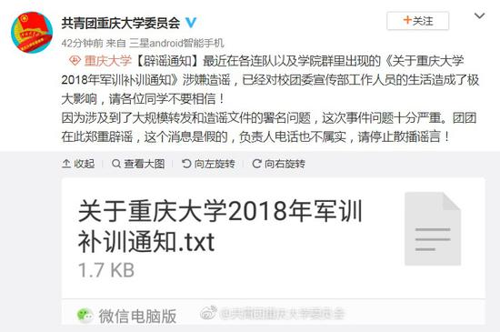 2018年军训补训通知 重庆大学团委辟谣:假消息