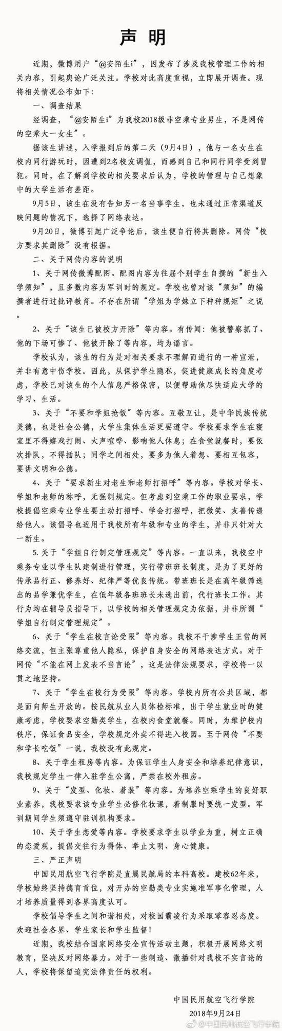 新生被学姐霸凌现象辟谣 中飞院:不存在所谓立规矩之说