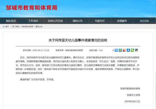 邹城通报“幼儿园教师体罚幼儿”:未发现网传“针扎幼儿”现象